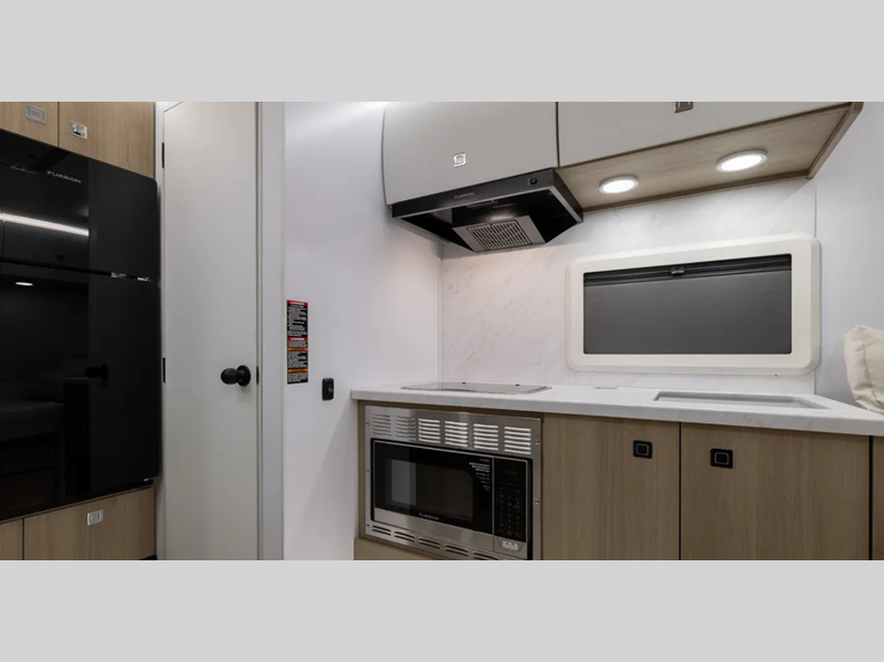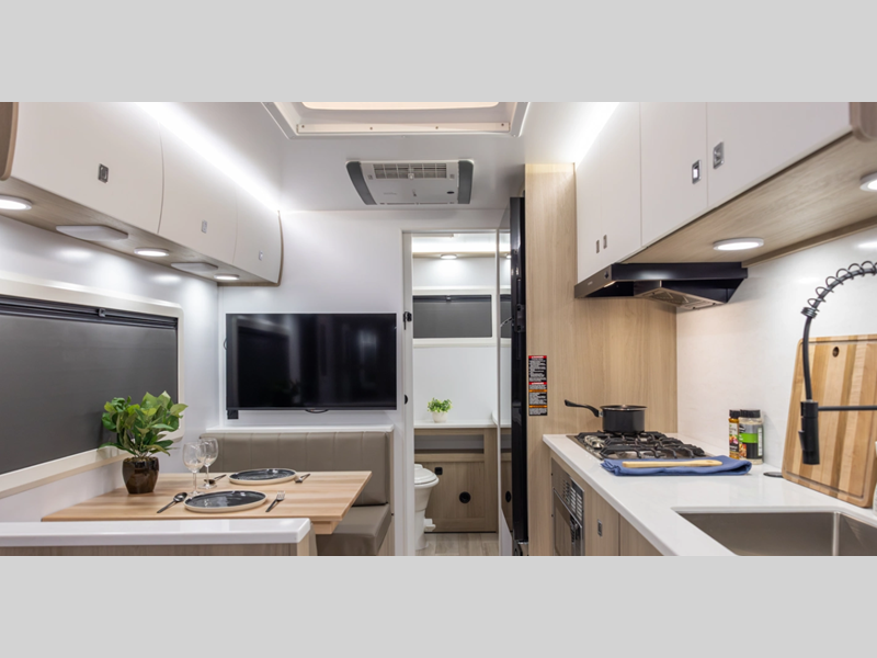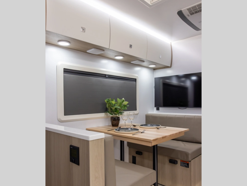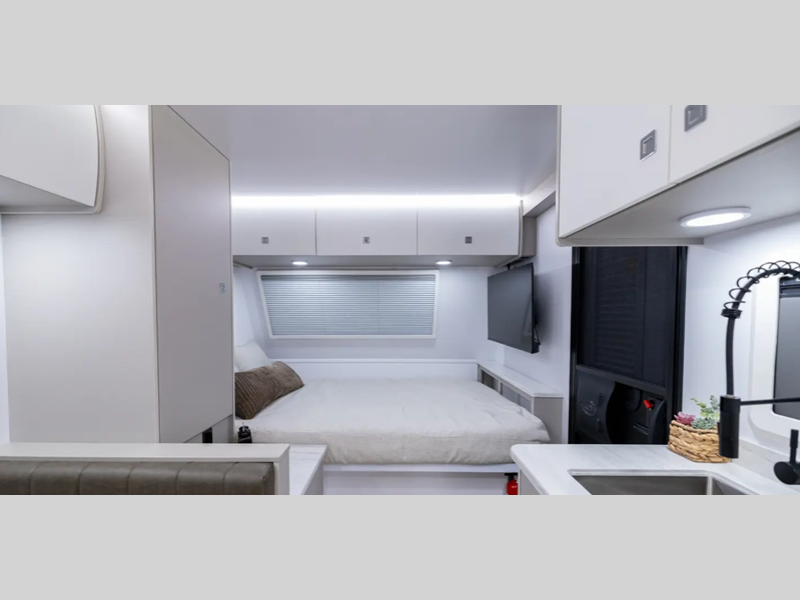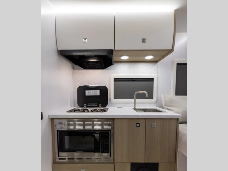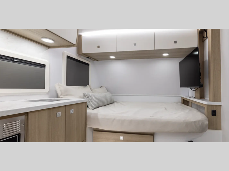 Sleeps 2 Length 17 ft 11 in Ext Width 7 ft 6 in Ext Height 10 ft 7 in Exterior Color Desert (Gloss Tan), Snow (Gloss White), Black Out Edition (Gloss Charcoal) Hitch Weight 630 lbs GVWR 5868 lbs Dry Weight 4583 lbs Cargo Capacity 1285 lbs Fresh Water Capacity 34 gals Grey Water Capacity 30 gals Black Water Capacity 30 gals Available Beds Queen Refrigerator Type 12V Black Glass Refrigerator Size 4.3 cu ft Convection Cooking Yes Cooktop Burners 2 Number of Awnings 1 LP Tank Capacity 20 lbs Water Heater Capacity 6 gal Water Heater Type Gas/Electric AC BTU 13500 btu TV Info Smart TV Awning Info 9' Carefree Legless Power w/Wind Sensor Axle Count 1 Number of LP Tanks 2 Shower Type Standard Solar Wattage 200 watts Similar Floorplans