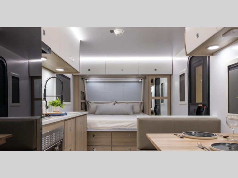 Sleeps 3 Length 24 ft Ext Width 8 ft 6 in Ext Height 10 ft 9 in Exterior Color Desert (Gloss Tan), Snow (Gloss White), Black Out Edition (Gloss Charcoal) Hitch Weight 785 lbs GVWR 8900 lbs Dry Weight 6643 lbs Cargo Capacity 2257 lbs Fresh Water Capacity 65 gals Grey Water Capacity 30 gals Black Water Capacity 30 gals Available Beds Queen Refrigerator Type 12V Black Glass Refrigerator Size 10.6 cu ft Convection Cooking Yes Cooktop Burners 3 Number of Awnings 1 LP Tank Capacity 20 lbs Water Heater Capacity 6 gal Water Heater Type Gas/Electric AC BTU 13500 btu TV Info Smart TV Awning Info 14' Carefree Legless Power w/Wind Sensor Axle Count 2 Number of LP Tanks 2 Shower Type Standard Solar Wattage 200 watts Similar Floorplans