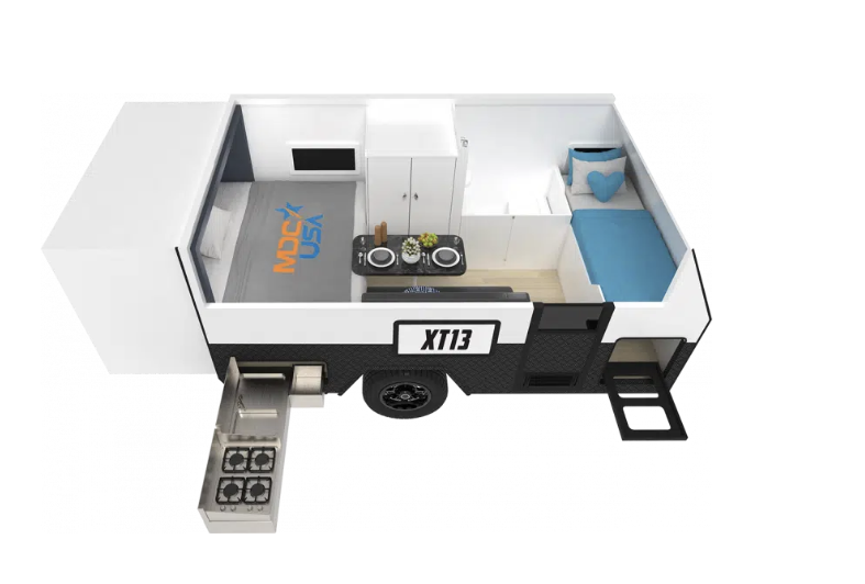 For those looking for a simple way to travel on any terrain, check out this model! Don't let the compact design fool you either, this unit is feature-packed with everything you need. Enjoy the exterior slide stainless steel kitchen featuring a three-burner cooktop and sink with hot and cold water. An external refrigerator slide along with storage for all of your gear to be safely tucked away when not in use. The triple-seal hatches assure that things will stay clean during travel. You will also appreciate the exterior electric awning to provide outdoor cover while cooking and relaxing. On the inside, a large sleeping area featuring a custom pillow-top Olympic queen mattress for a great night's rest. You will also find a wet bath for added convenience!