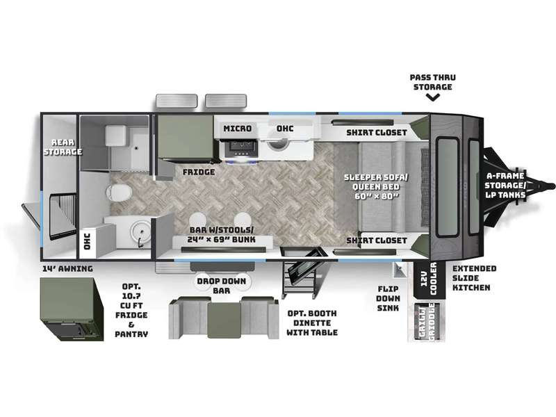 The galley kitchen is fully equipped with a refrigerator/freezer, sink, induction cooktop, and ample counter space for meal prep. Whether you’re cooking campsite dinners or quick breakfasts on the go, everything is designed for efficiency and convenience.